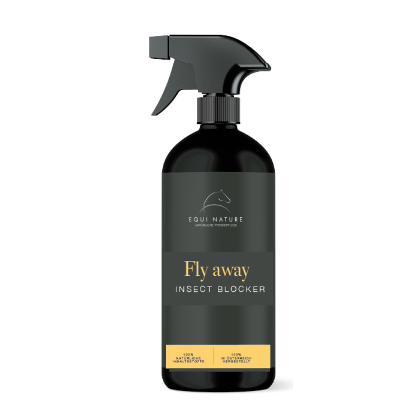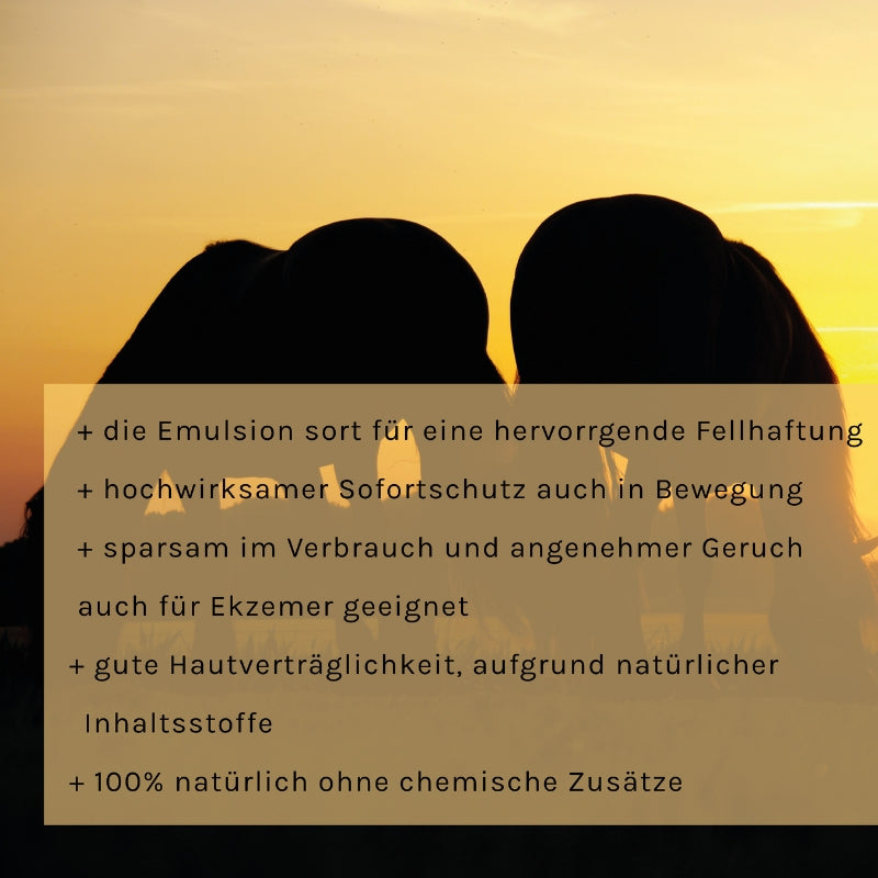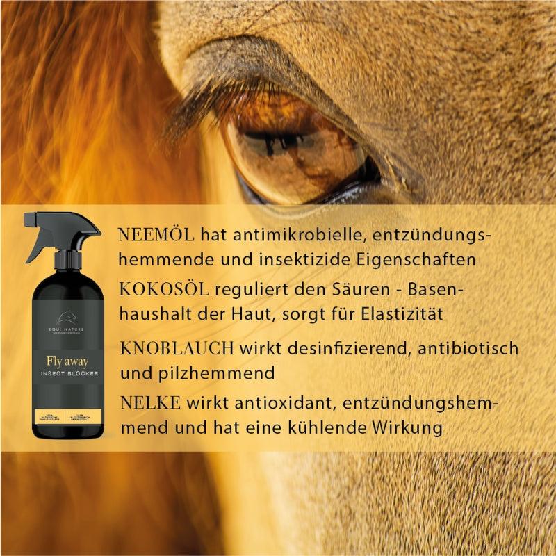 Der natürliche Insektenschutzspray „Fly away“ ist eine Kombination aus hochwirksamen, natürlichen Fetten und ätherischen Ölen, die den Schweissgeruch von Pferden überlagert und zusätzlich einen abwehrenden Geruch auf die Insekten ausübt. Die Wirkung besteht aus rein natürlichen Substanzen und ist ökologisch absolut unbedenklich. „Fly away“ ist ein natürlicher Fliegenblocker gegen Kriebelmücken, Schnacken, Bremsen und weitere blutsaugende Insekten. Durch jeden Einsatz verbessert sich der Fliegenblocker und legt sich wie ein Schutzfilm auf Haut und Haar.