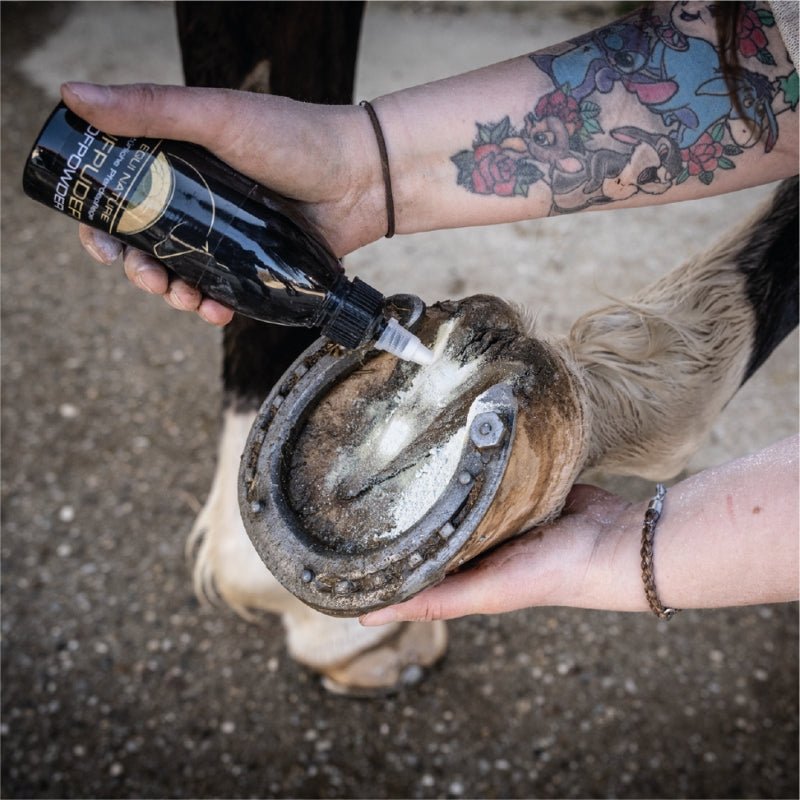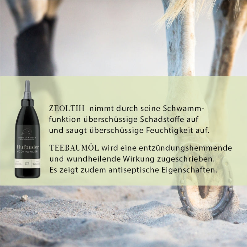 und Strahlfäule normalerweise verantwortlich sind, wird somit der Nährboden entzogen ohne den Huf oder die Haut selbst auszutrocknen. Das Puder legt sich wie ein Schutzfilm über die Sohle. Durch die Beigabe von Teebaumöl wird die antibakterielle Wirkung noch unterstützt.