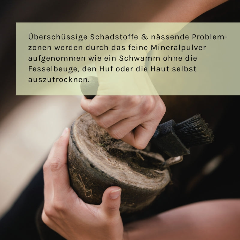 Um die Ausweitung von Hautproblemen zu vermeiden, kann man auch vor dem Aufbringen des Puders oder zwischendurch den gesamten unteren Beinbereich mit unserer Huf & Fesselpflege besprühen. Eine weitere Option wäre das Pferd in der Box mit der Zeolith Einstreu noch zusätzlich zu unterstützen bzw. den Stoffwechsel des Pferdes im Frühjahr und im Herbst mit einer Detoxkur zu unterstützen.